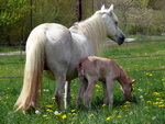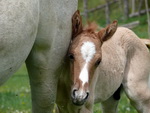 Je m'éloigne, rejoins Stef qui nous a encouragées derrière la barrière à quelques mètres de nous ! Les moments qui suivent sont tout simplement magiques : Ithaque parle à son poulain avec des sons que je n'avais jamais entendus sortir de la bouche d'un cheval ! Une petite mélodie, très aigüe et toute douce, avant de le sentir puis de se lever. Le premier contact naseau/nasal est magnifique, et la première rencontre vocal entre la mère et son poulain est inoubliable… Le poulain mettra plus d'une heure à se lever, avec les encouragements de sa mère, et quelques premières galipettes super impressionnantes !! Monté sur des échasses, il titube, cherche son équilibre, et finit par arriver à se tenir debout ! Premier réflexe et pas des moindres : il cherche directement la mamelle de sa mère, mais ce n'est pas évident…